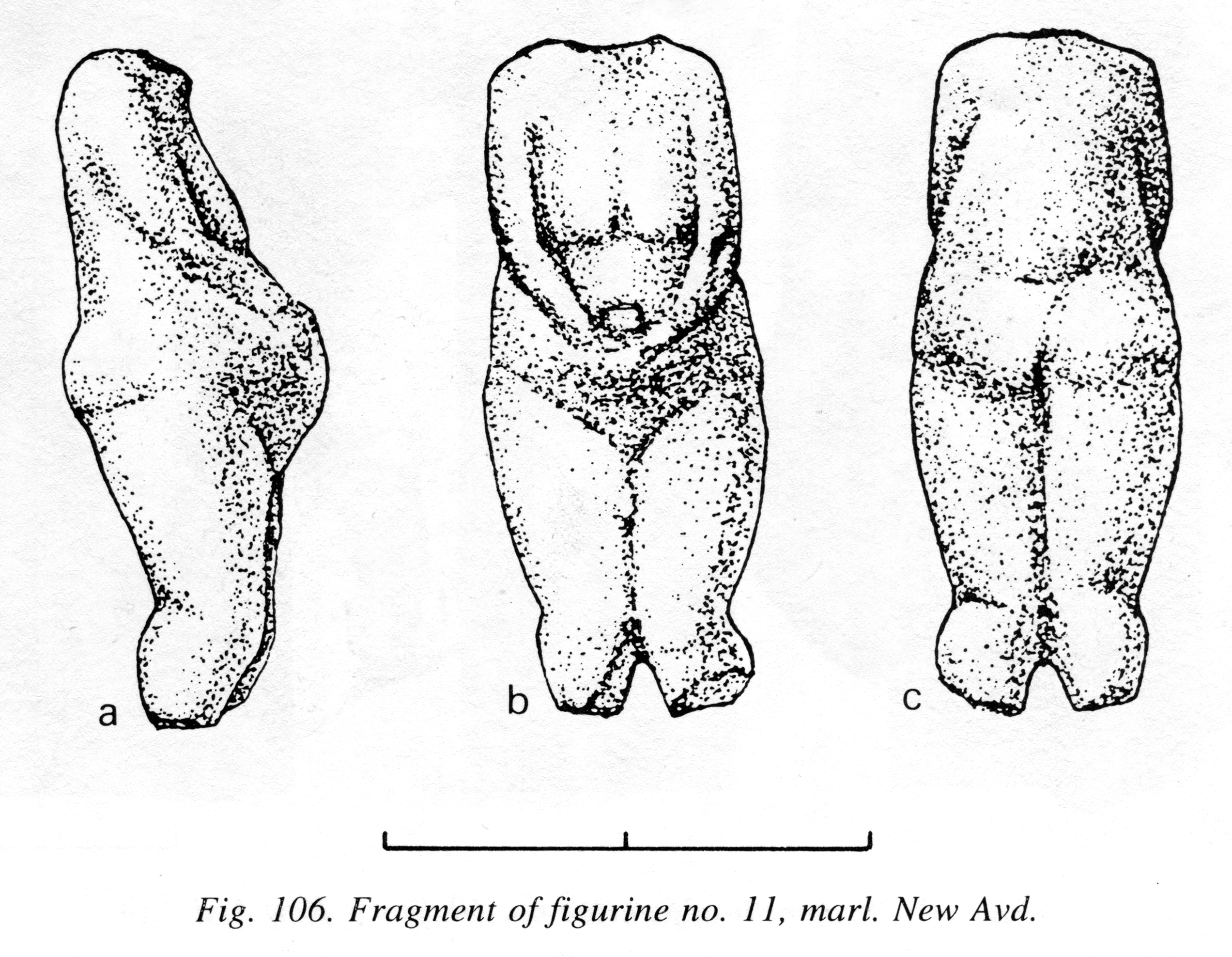 Figurine No. 14 (New Avdeevo Avd-N 87, N 3) is quite unique. We have glued it together from several fragments of marl. About two thirds of the body, forming its lower part, are preserved. The length of the fragment is 41 mm. The front side of the figurine is almost flat; only a slightly slanting plane renders the transition from the abdomen to the pubic triangle.