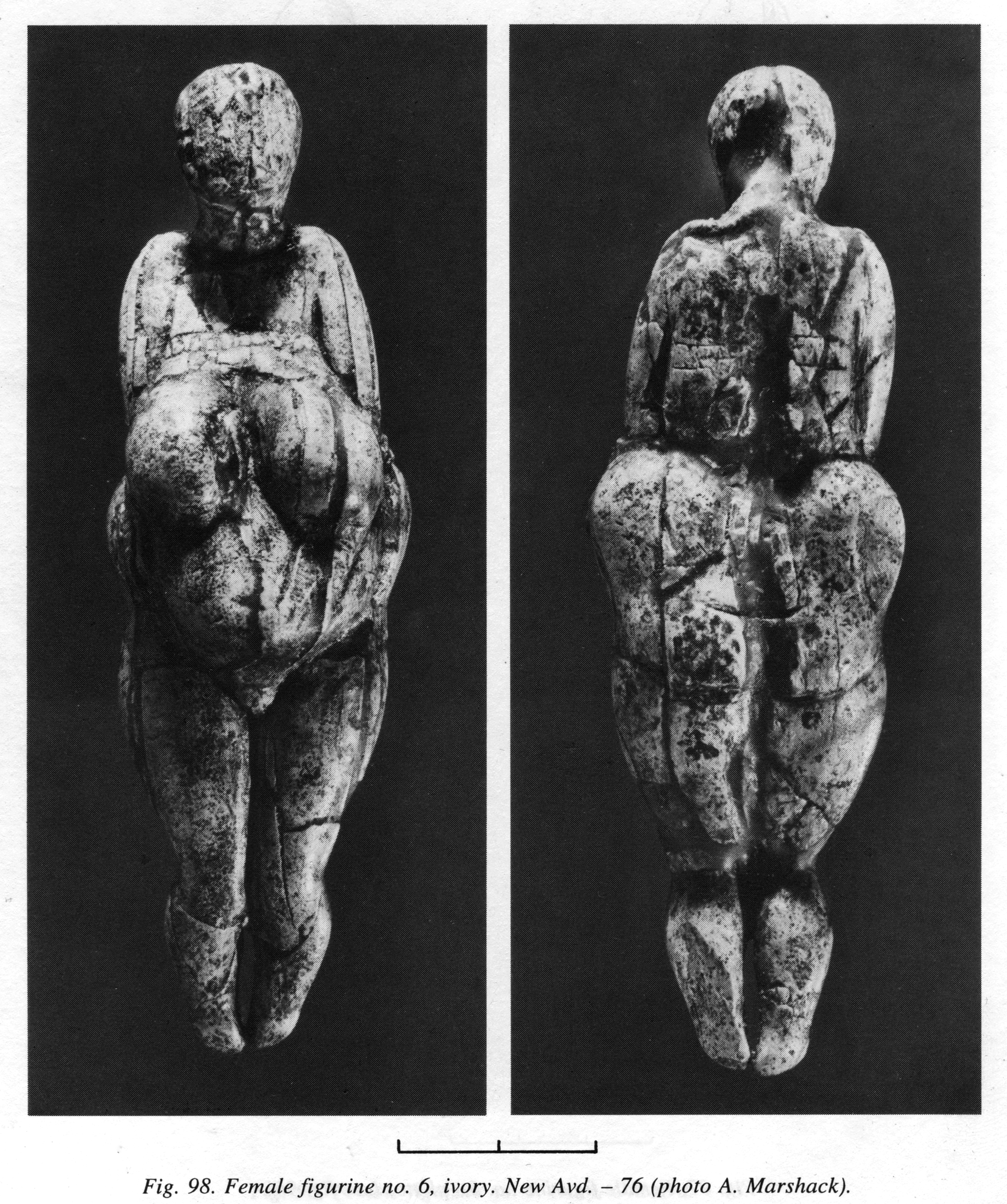 Figurine No. 6 (New Avdeevo Avd-N 76) was found lying horizontally, face-down at the bottom of the pit. It is 95 mm long; the maximum width is in the upper third of the pelvis and equals 30 mm. Only insignificant fragments of the outer surface are damaged: parts of the face, neck, the lower side of the calves, back and buttocks. The scale on the photos appears to represent 2 x 10 cm.