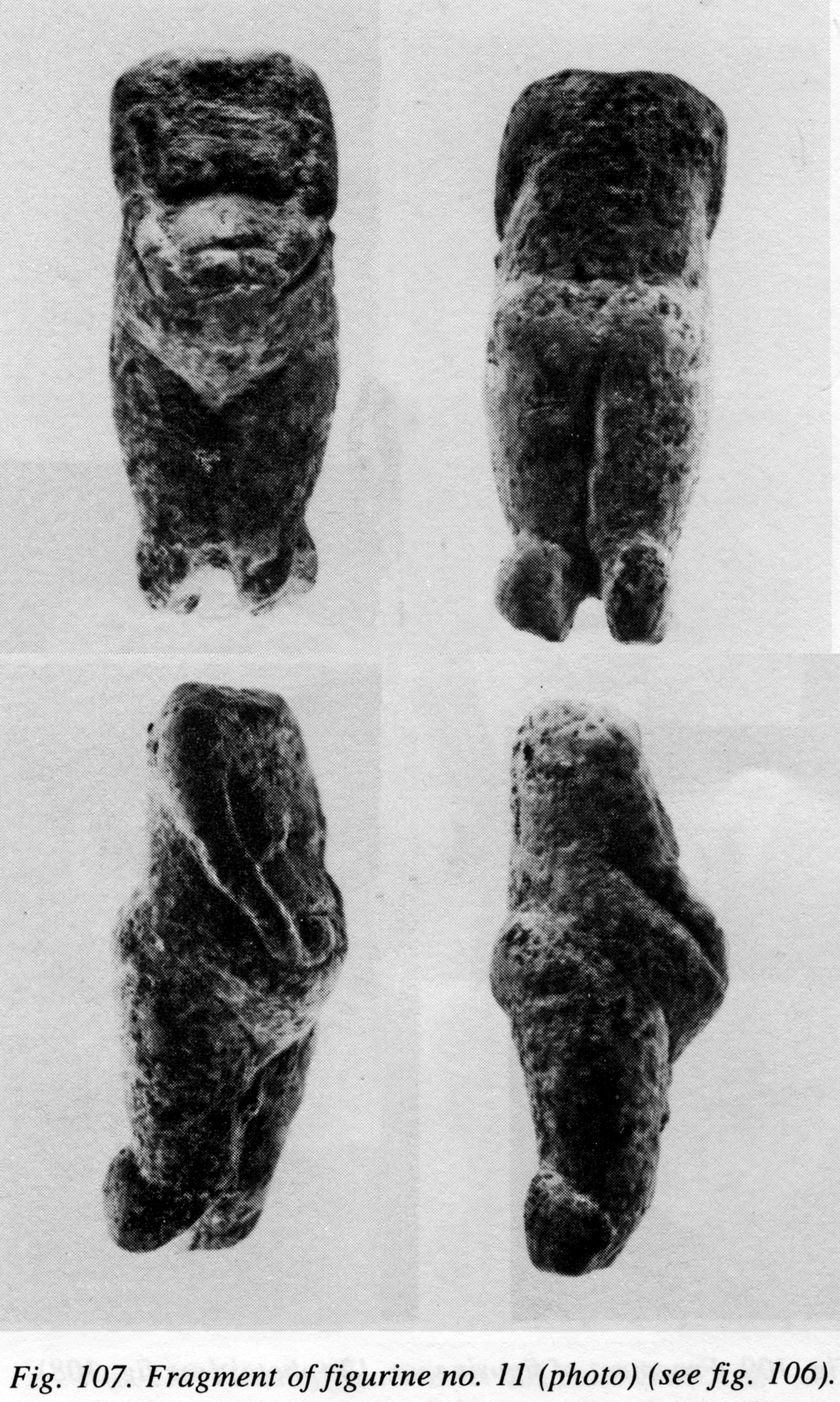 Two short symmetrical lines are cut near the sides above the waist (fatty folds?). The rump is rendered in a traditional way. In contrast to the two figurines from this pit described above, figurine No. 8 has no band-bandages. The head has a decoration, depicting hair (?). It is formed by concentric rows of short slanting strokes (Figures 103; 117: 1).