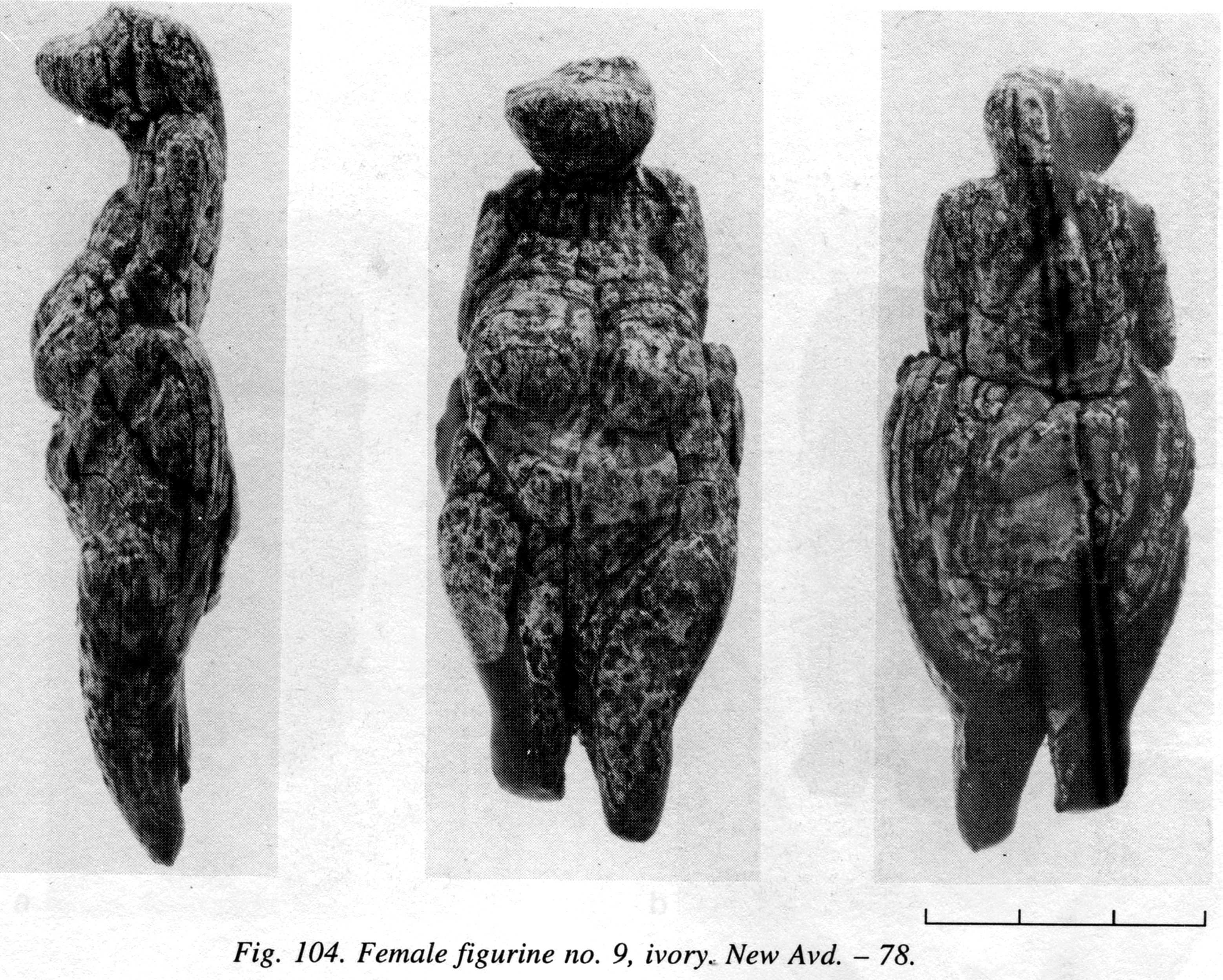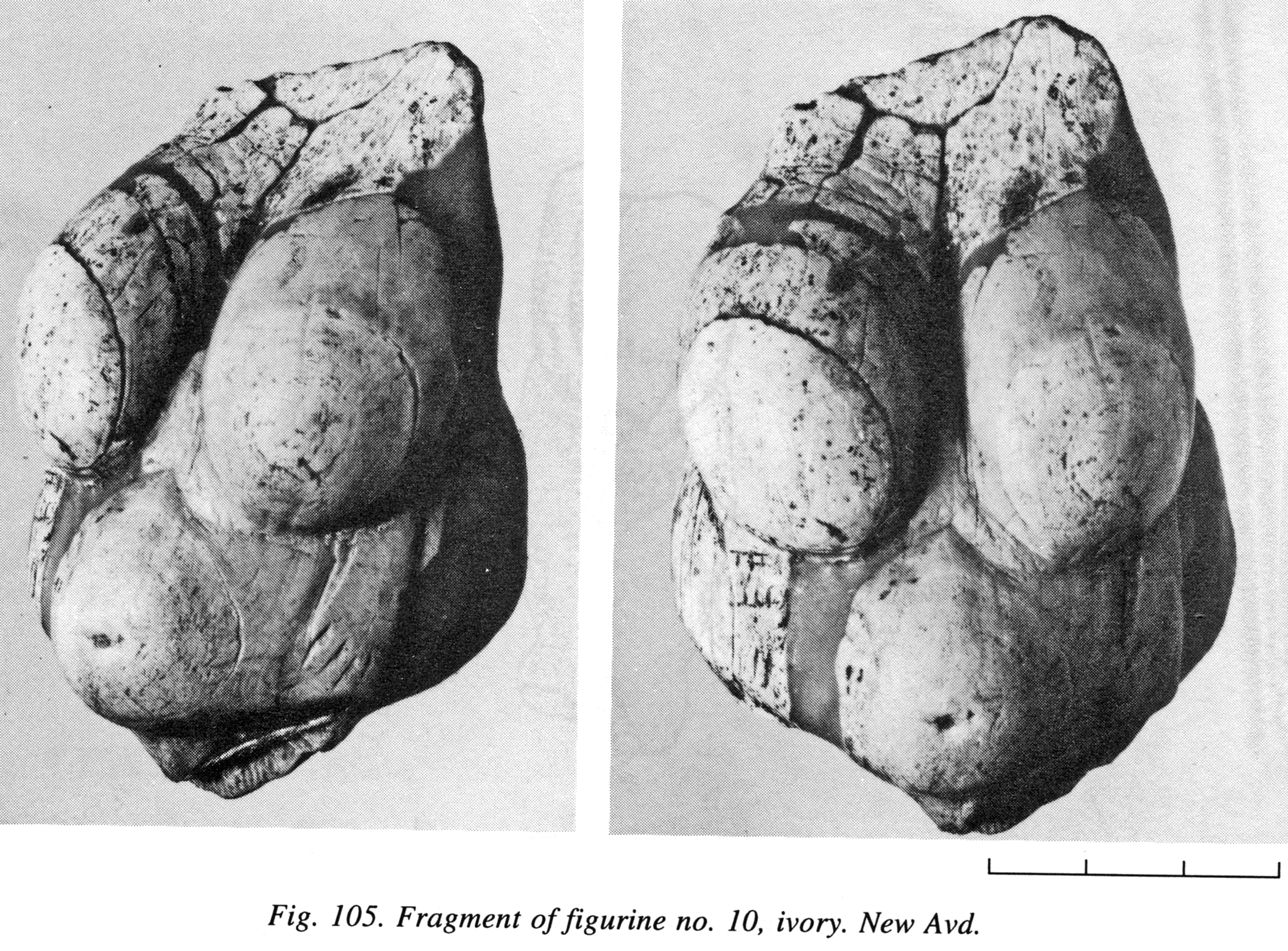 Figurine No. 10 (New Avdeevo Avd-N 87-88). In 1987 and 1988 two ivory fragments were found at Avdeevo (Figure 105). Both fragments represent massive flakes, which are the result of a strong vertical blow rather than the products of natural splitting of ivory. One fragment was found at the bottom of a pithouse, the second was found in the fill of a pit. The distance between these two elements of the layer was about 14 cm. It turned out that both fragments were pieces of one and the same figurine. All that remains of it is the front side, from the shoulders to the public triangle.