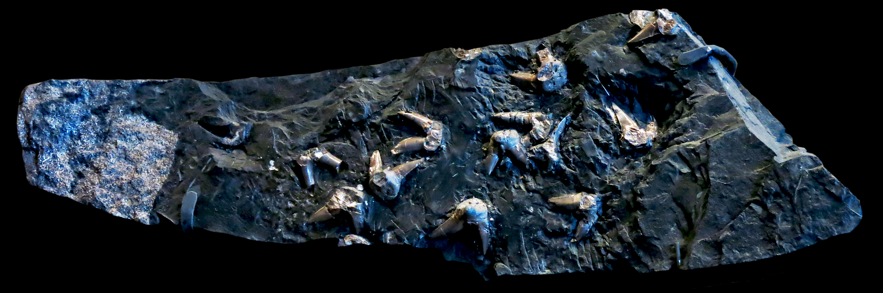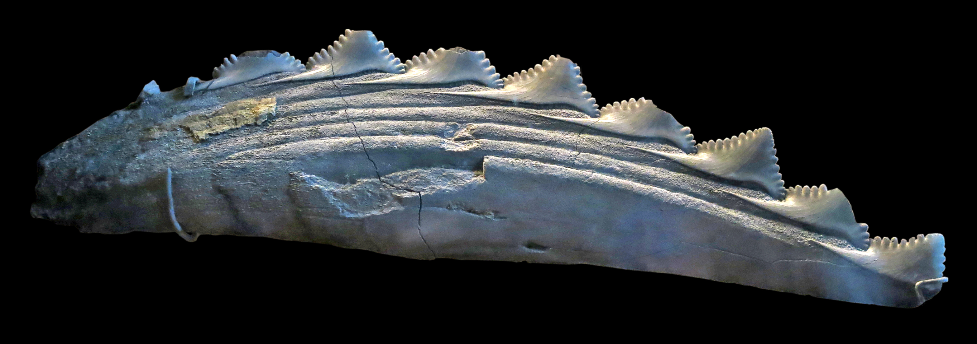 This piece of lower jaw with several dagger-like teeth is from the first T. rex fossil ever discovered.
