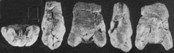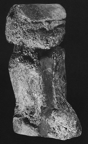 There are several cutmarks which are not very clear. The back is prominent, with small asymmetrical buttocks. Judging by the fragment's proportions, the breasts and shoulders were not shown. The legs are especially carefully worked. They are wide apart at the hips, and sharply bent at the knee. The shins are turned backwards and pressed against the bottom of the buttocks. The feet, in contrast to the Kostenki figurines, are large, maybe even enlarged out of proportion. The buttock area is somewhat damaged and rubbed, which makes it impossible to define the exact location of the feet - they either have the toes together, or the right sole lies above the left one (Figures I 11, 112).