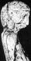 Figurine No. 13 (Old Avdeevo Avd-St 88) represents a fragment of the head of a large marl figurine. Its height is 38 mm, and the lengthwise diameter is 35 mm. The head is broken along the base of the neck. The front part of the face is cut off. The modelled cheekbones show that the face was not turned downwards. The lengthwise diameter is greater than the transverse one, thus making the head somewhat elongated. A cap (?) or a coiffure (?) is shown on the head by concentric horizontal bands, ending on the top of the head in a spiral. The bands are decorated by deep transverse straight notches, making up a row of irregular quadrangles. As a result the general view of the ornamental decoration on the cap can be defined as a net or checkwork (Figure 110).
