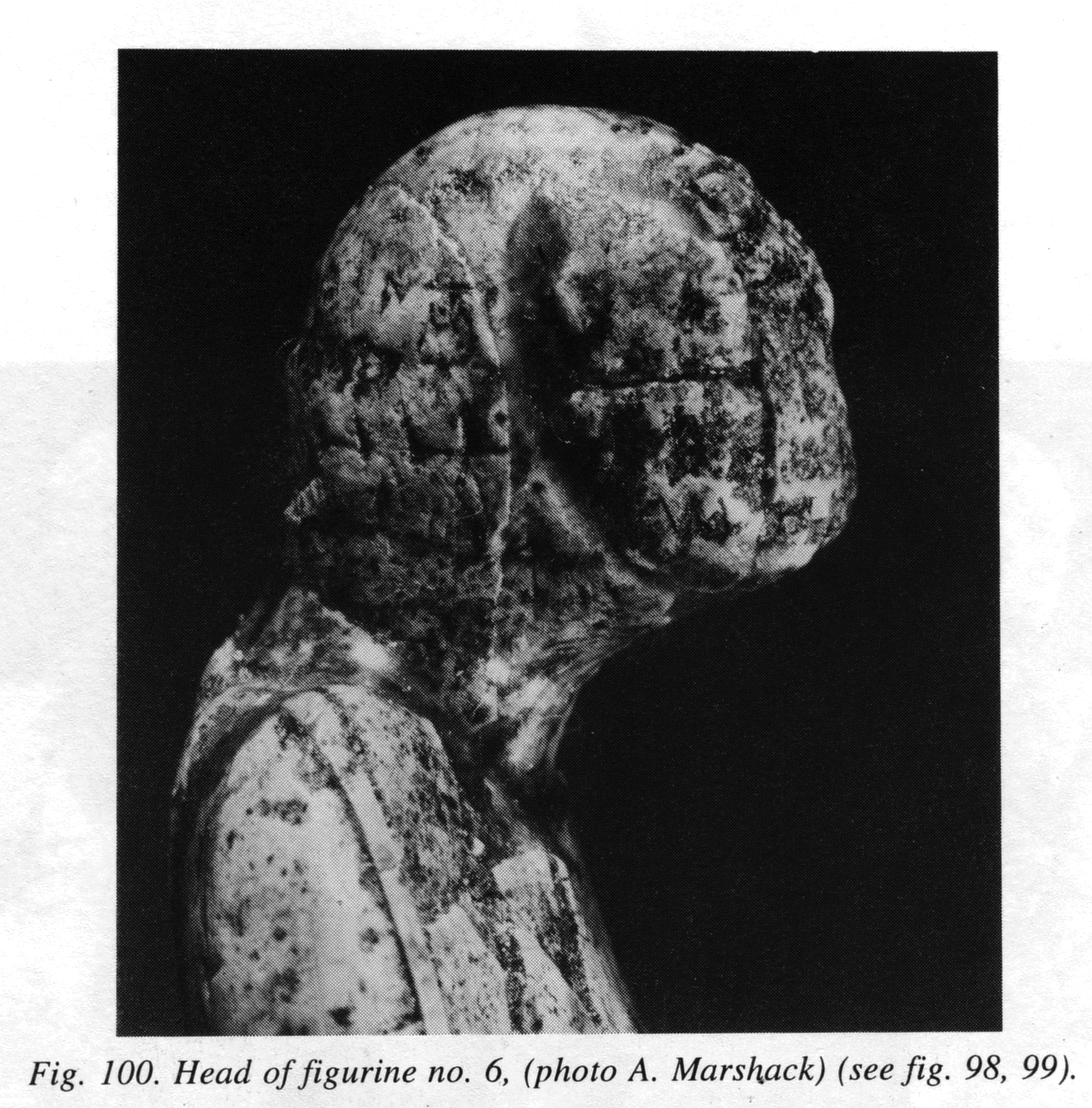 At Avd-II, as well as at K-1, female figurines made from marl and chalk were also found. At Avd-I marl was not used for the manufacture of artifacts. At Avd-II the marl figurines are only represented by fragments: heads, and bits and pieces of legs or torso. All of them are small. The marl fragments were found in the cultural layer at all levels or in the upper portion of the fill in the pits. We shall now describe the most interesting marl figurines.