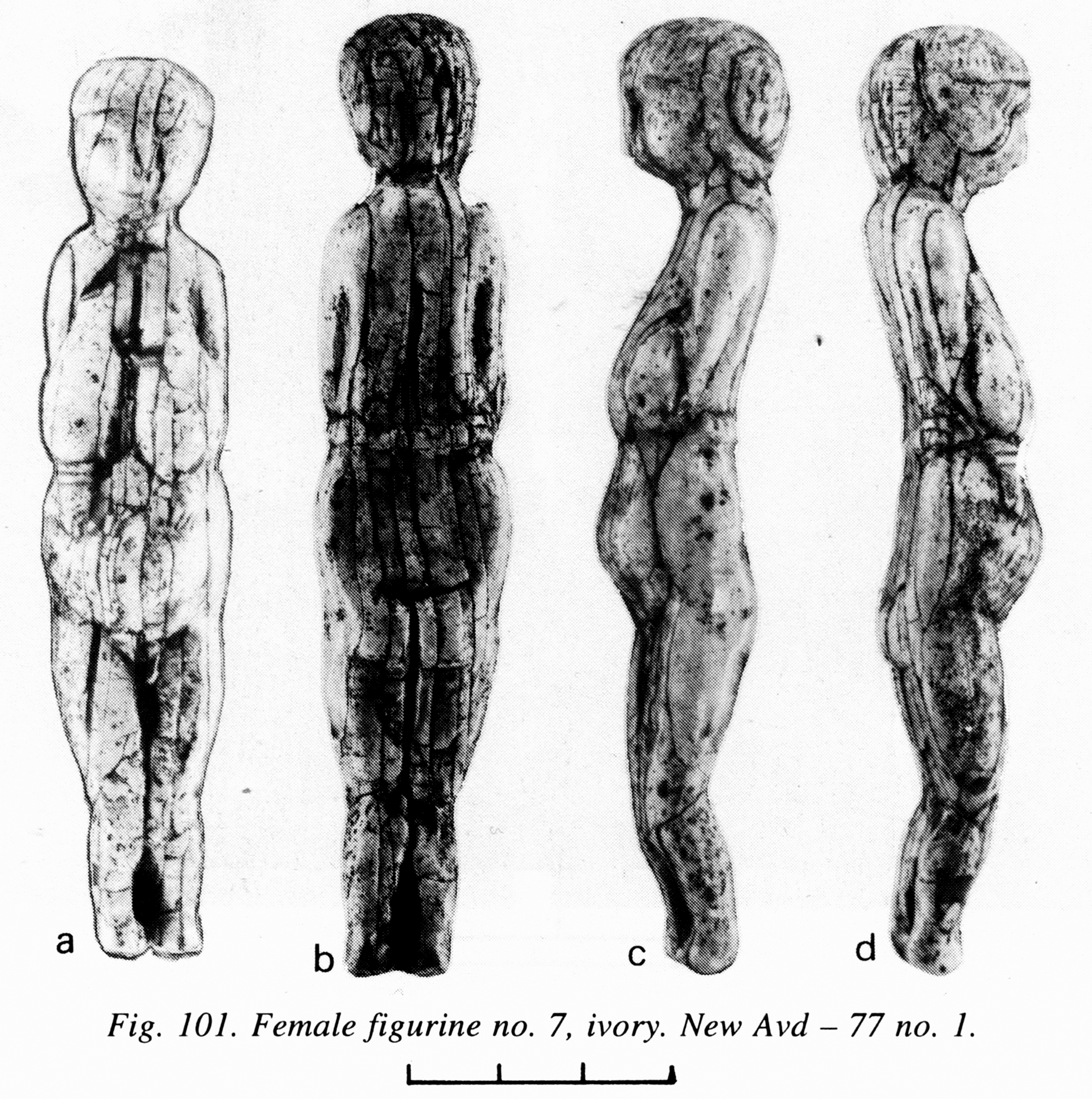 Another ivory figurine, No. 9 (Avd-I 78), was found in the cultural layer in 1978. The length of the body is 90 mm, and the width is 30 mm. The legs below the knees and some other parts of the surface are missing. The rump area is damaged.