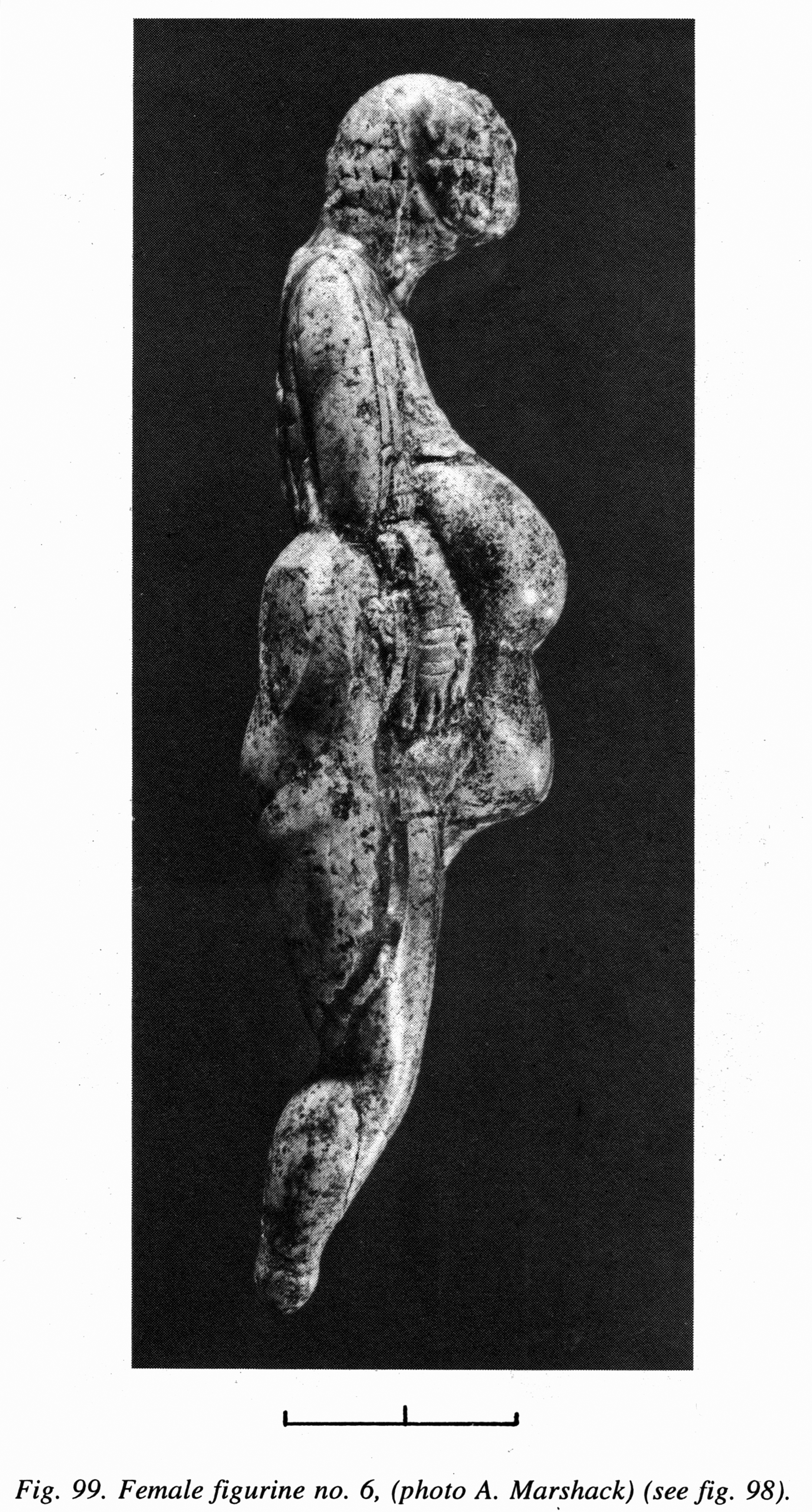 The abdomen is slightly prominent, with the greatest protuberance at the centre. ne legs are a little bent at the knees, and the shortened shins are bent slightly backwards. Below the knees, the legs are separated by a cut-through slot; the toes are brought together, the heels are apart. A slightly prominent back is bent backwards. A small curve represents the base of the neck, and a small depression in the shoulder-blade area depicts the spine (?). On the waist there is a band in relief decorated by a wedge-shaped notching. The rump is shown in the traditional manner: a flattened area around the sacrum emphasizes the absence of fatty deposits. The buttocks, set off from above and from below, seem to be placed very low.