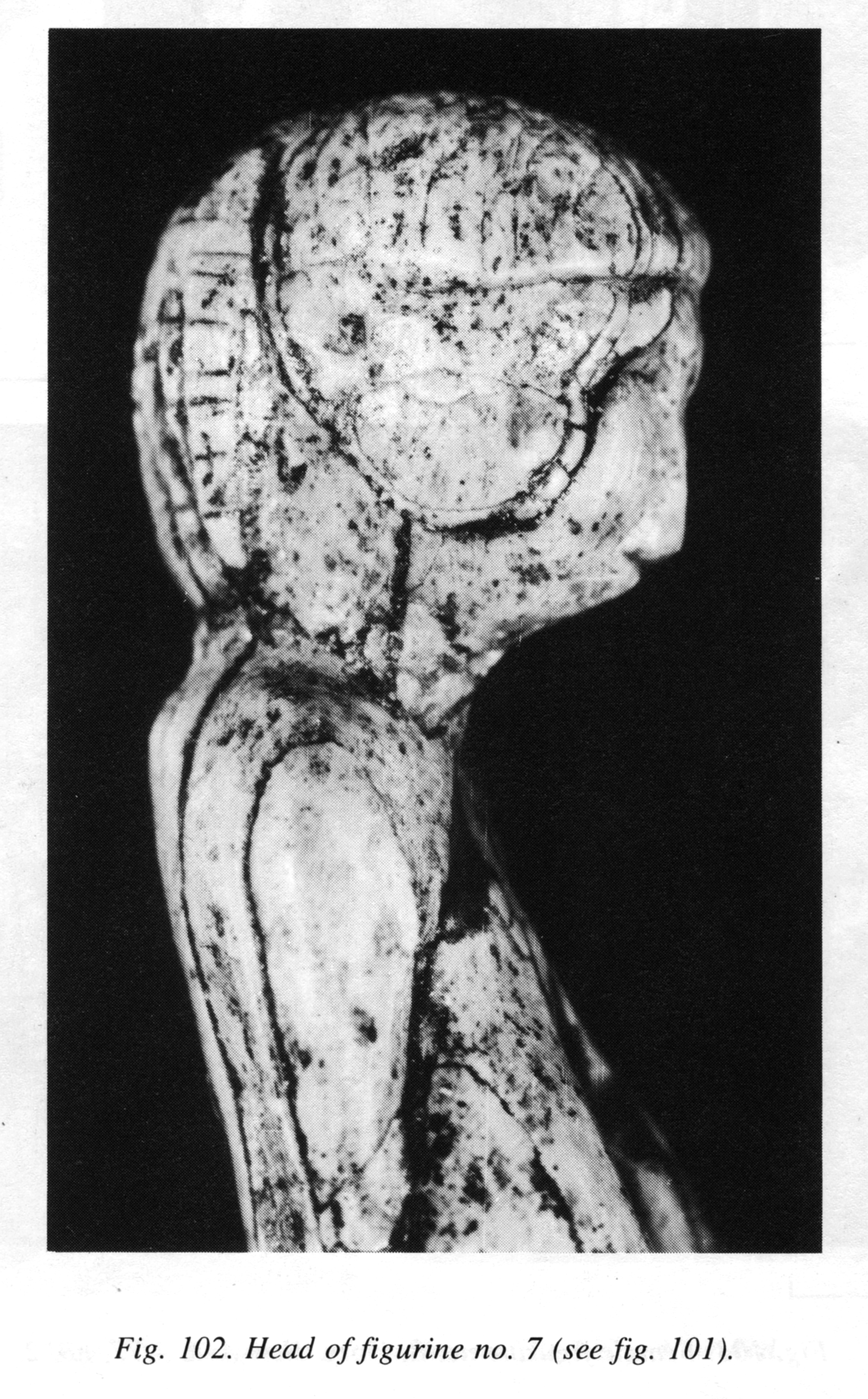 The figurine is well preserved, except for small damaged spots on the outer surface. It is 100 mm long; the widest part, the upper third of the pelvis, is 20 mm; and the thickness of the upper torso and that of the hips almost coincide (Figure 101). The head is erect; the sculptured face looks forwards and is contoured by a complex coiffure (Figures 102; 117: 3). The shoulders are narrow and drooping. The chest is flattened, and the drop-shaped breasts, slightly apart, lie on the abdomen. The arms and the shoulders are slightly bent forwards, and the forearms are placed beneath the breasts, under which the hands are holding the upper part of the abdomen. Fingers are emphasised on the hands, one of which wears a bracelet.