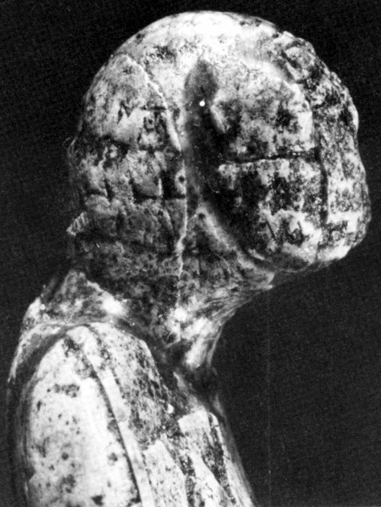 The head is rounded, slightly flattened from behind; the face is not defined, but the facial region is definitely set forward. The shoulders are almost straight and not drooping, the back is slightly bent backwards. The shoulder-blade area, divided by a groove, is shown in relief. The location of the arms is not symmetrical: they are prominent in the shoulder-area in proportion to the thickness of the body.