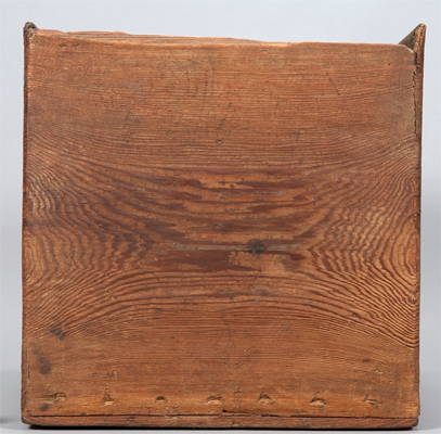 This is described as a large square bentwood box with uneven upper edges. The joining corner and the bottom are sewn together with strips of twisted cedar rope.