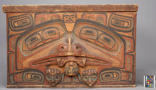 Visible on this box is a bright-red trade pigment, vermilion. It was likely introduced to coastal peoples in the late 1700s or early 1800s, when fur traders returned from China with goods to trade for sea-otter pelts.