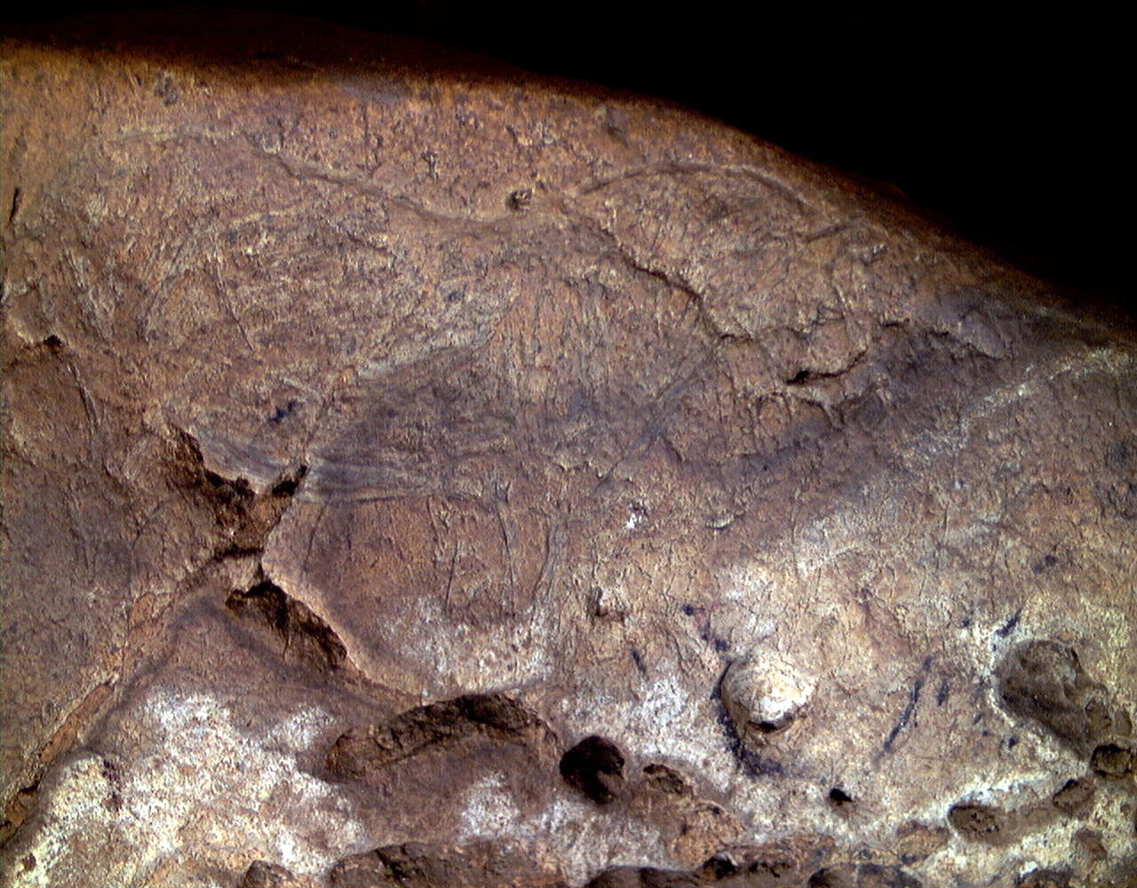 This figure of a horse facing right is drawn with a simple engraved line. It was produced in a hollow of the left-hand wall of the cave, where the rock has a cracked surface. The irregularities in the wall do not allow the figure to be seen with clarity.