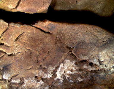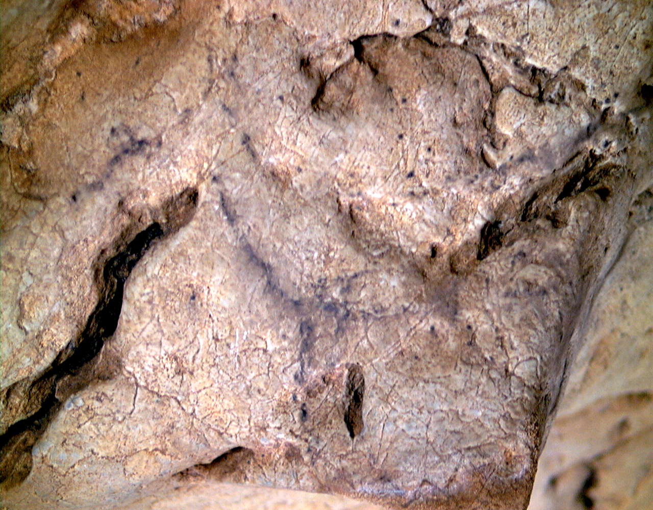 Continuing along this passage for another seven metres, we find, on the right-hand wall, an alcove with the representations of several animal figures, both engraved and painted in black. On the left, three complete figures of horses were engraved, and a bison was represented by combining the techniques of engraving and painting in black. Doubtlessly the most significant figures in El Buxu are depicted on the right. The central figure in this composition is a stag in black paint. Although the pigment is badly faded, the head, antlers, chest and back are clearly seen. The broad shape of the antlers seem to suggest this is a fallow deer, although some reticences could be made about this identification, mainly because so far no skeletal remains definitely of this species have been found in Cantabrian Upper Paleolithic sites. It must also be mentioned that the animal is depicted as roaring, with an open mouth, a slightly raised head and a swollen chest. A horse is engraved in the interior of this figure, and below it a stag is engraved and painted in black, and an ibex engraved. The largest figure in the cave is located in the upper part of this panel: the representation of a stag, engraved and painted in black. This figure has almost completely disappeared, and nowadays it is only possible to see the lower part of the front limbs. A small engraved ibex is found in the interior of this animal's body.