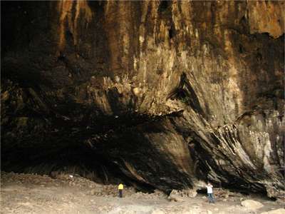 View of the exterior of Shanidar Cave, taken during the summer of 2005. Note for scale the two crouching men in front of the cave. At the time this photo was taken, the interior of the cave was being used as a pen by a local shepherd.