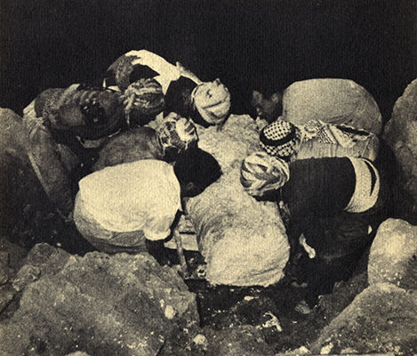 The floor is covered with simple shelters for its Kurdish inhabitants and corrals for their animals. In this photograph Kurdish workmen have just begun the excavation of the earthen floor of the cave. Bedrock was reached at a depth of 45 feet.