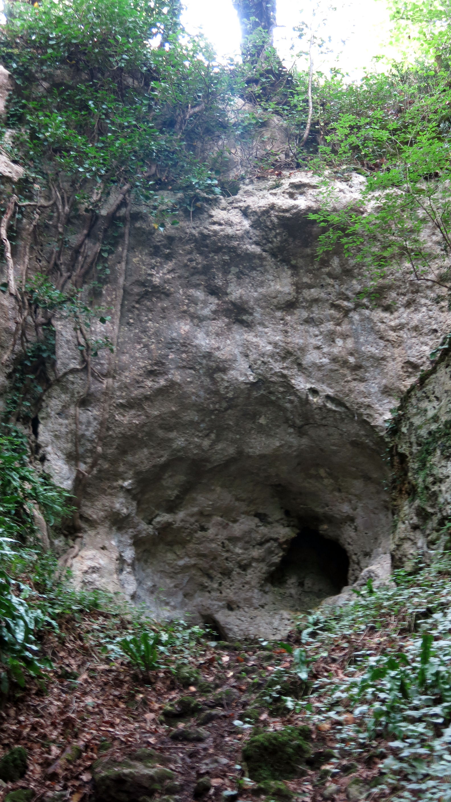 Caves can form for a number of reasons, including being part of a former underground river system, but these seem to have formed when water has percolated down through the limestone to reach a clay or marl layer, forming a spring at the base of the wall, which gradually dissolves the rock, forming a cave. Frost action on the back of the cliff where the rock is wet can then enlarge the cave and abri.