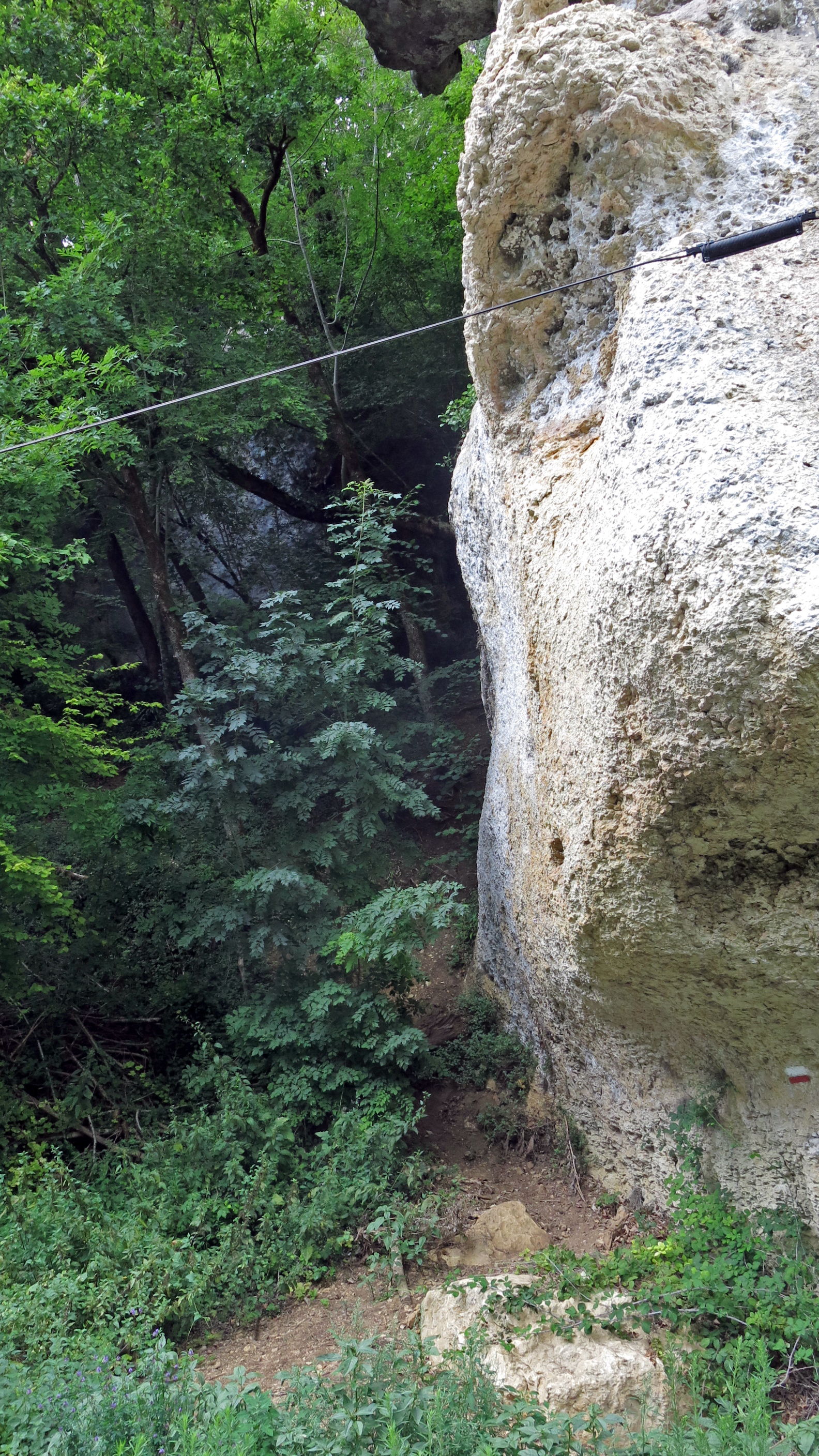 Note the moss, ferns and lush vegetation growing in a horizontal layer in this section of the cliff, where a clay or marl layer prevents water from percolating further down the rock, and moisture seeps out at the junction of the limestone and clay or marl.