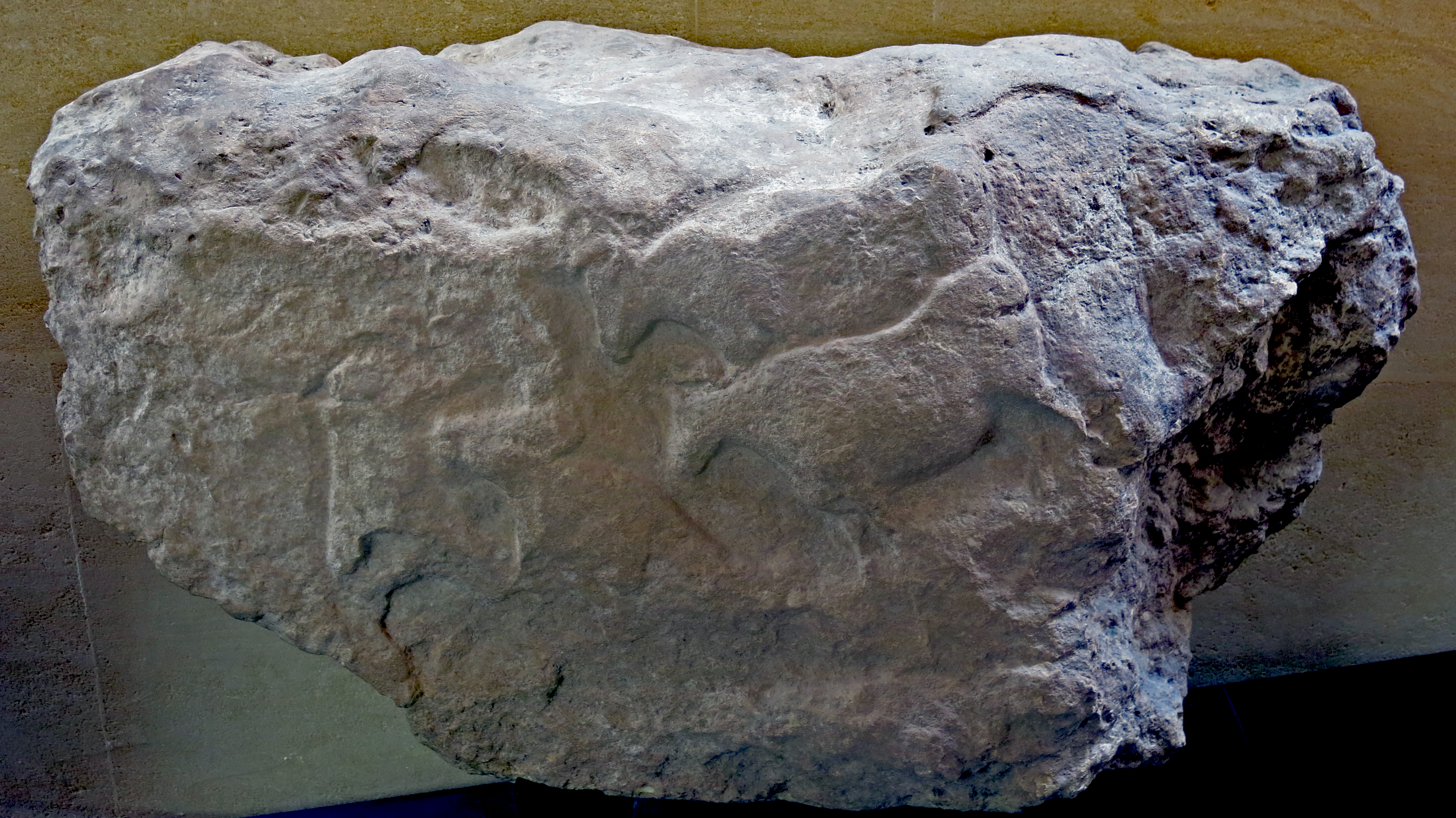 The other carvings do not appear to be from the same artist. A third aurochs is at right angles to the other two. It has an elongated head, coupled horns curved forward, back arched but only lightly modelled, the legs and stomach damaged by frost. The muzzle of this animal lies close to the groin of a fourth, with its head turned to the left and down the sharp edge of the block forming the forehead, while the muzzle, jaw, and chest are enhanced by the Champlevé technique. We can identify a wide groove around the back, buttocks legs and stomach which puts them slightly in relief. The horn is clearly indicated.