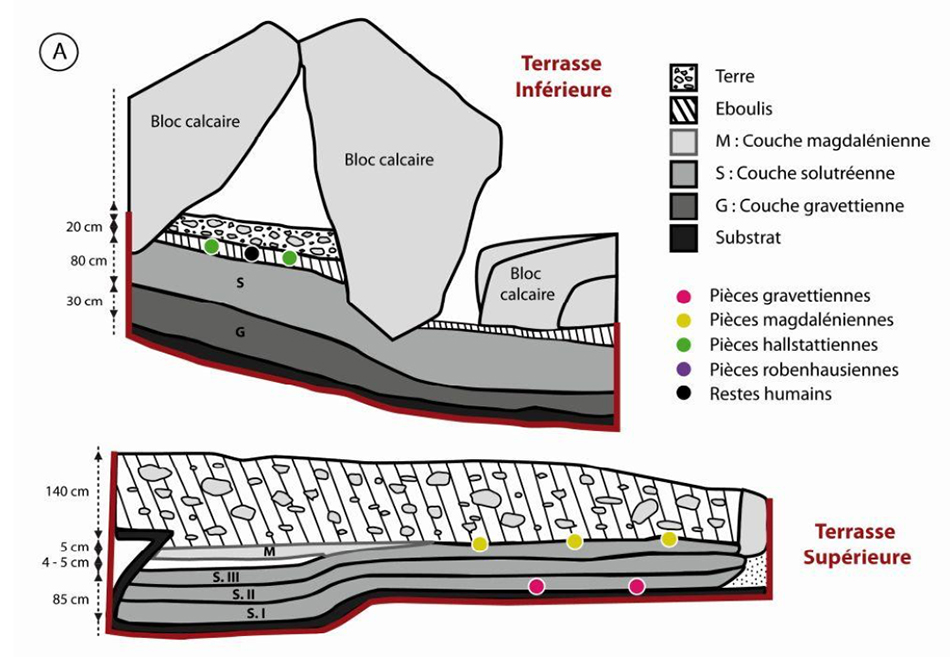 The lower and middle parts constitute the Peyrony cabin. This arrangement allowed the preservation of the archaeological deposits. The northern edge of