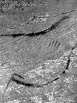 Abri du Poisson salmon closeup. There are seven lines engraved above the fish, and five holes drilled in the body of the fish.