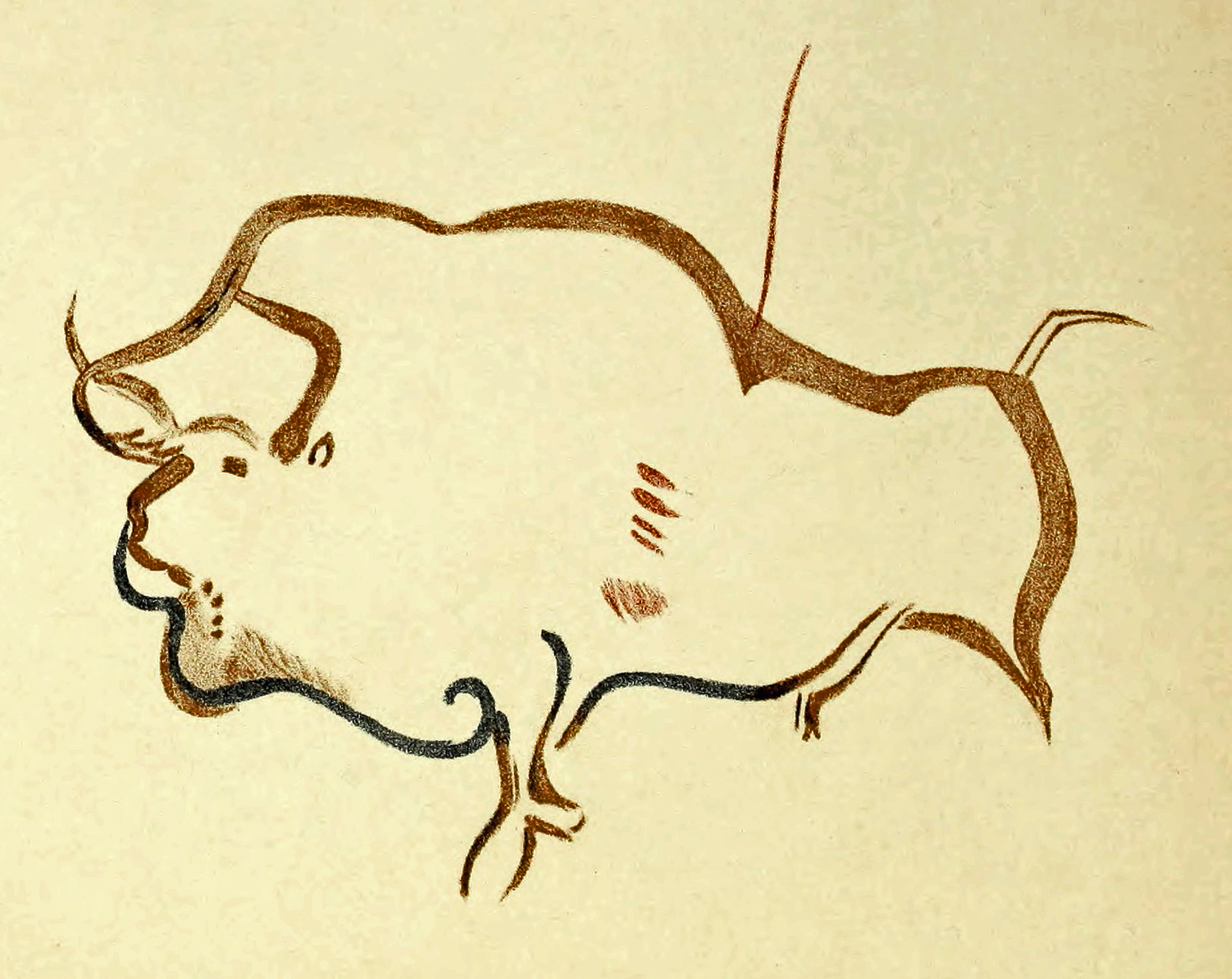 This large polychrome bison has its tail and dorsal line outlined in black, with the head and neck completed in brown and black. It is overlain by various linear symbols in red, as well as the ubiquitous thick red meandering line which is so much a feature of this panel, with paired red 'leaves' in this instance at regular intervals.