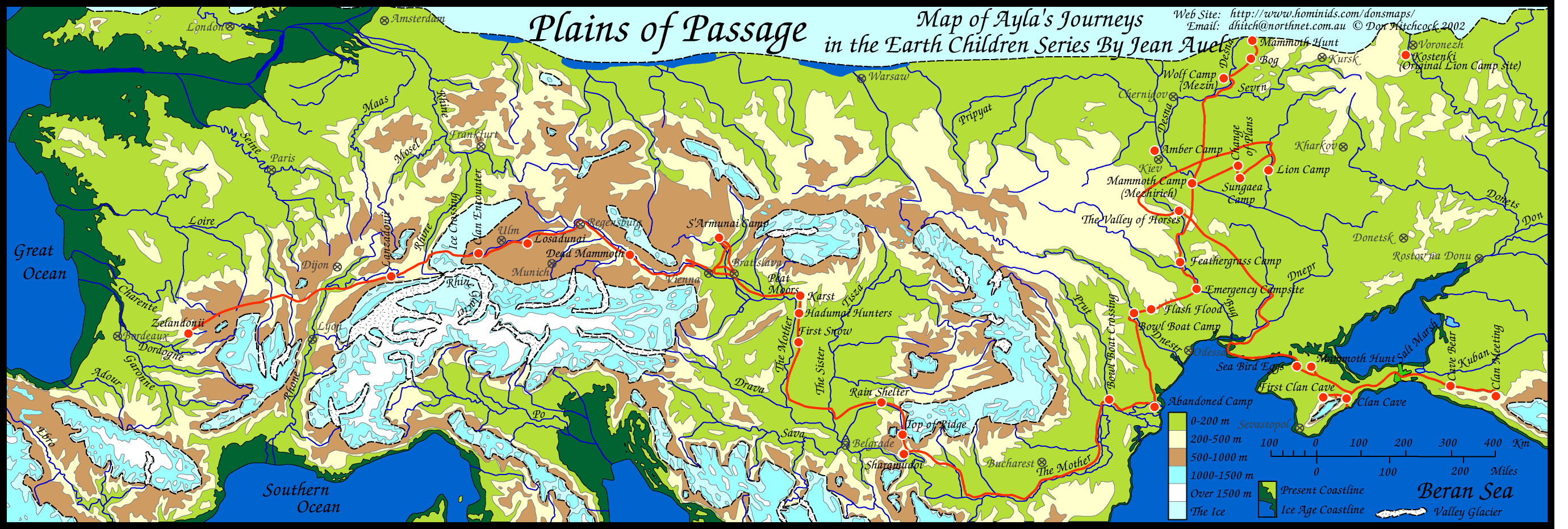 I love maps, and I was not happy with the standard of the map in the book 'Plains of Passage', in particular the journey across the ice. In my copy of the book, and in fact in pre-historical reality, when there was always an ice free southern route, Ayla and Jondalar could have avoided the ice crossing easily by going South a little. This map corrects that, and is more accurate so far as the Donau river course is concerned, and shows significant points on the journey. I have called it Plains of Passage, but all of Ayla's journeys are on this map. Jondalar and Thonolan pretty much followed the same course when going east, except that after the time with the Sharamudoi they took a boat down the river to the delta. Then after leaving the delta and Willow Camp they would have followed pretty much the same path as Jon and Ayla did on the journey to the Zelandonii, and finished up at the Valley of horses.