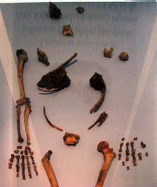 All bones of the skeleton, sometimes broken by the enormous weight of the earth covering them were in place in their corect anatomical place, and still solid. Only the bones of the foot and right hand had been moved, probably by a small carnivore, a rodent, and partly removed.