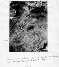 This three year old child, one of the best preserved for this age group was buried, lower limbs bent, in a trapezoidal pit dug into the soil. The skeleton was complete and undisturbed with the exception of the skull, apparently separated, but recovered a short distance away.