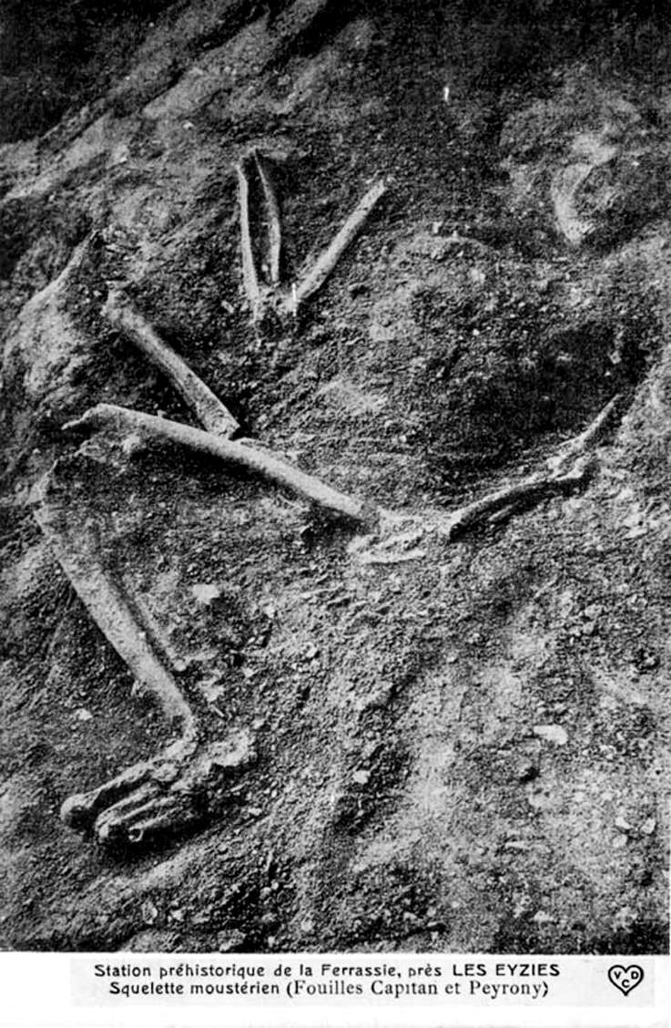 We then proceeded with great slowness and infinite precautions, starting with the lower limbs, with a veritable dissection of the skeleton, just freeing the bones but leaving them in place. Thus advancing step by step, the complete skeleton appeared to us then just as it had been laid down by its contemporaries, the Mousterian, extended on the back, the trunk slightly inclined to the left, legs very strongly folded under the thighs, the latter half bent over the pelvis, knees turned to the right, the left arm along the body, left hand at the left hip, right arm bent and the right hand near the shoulder, head turned left, jaw wide open.