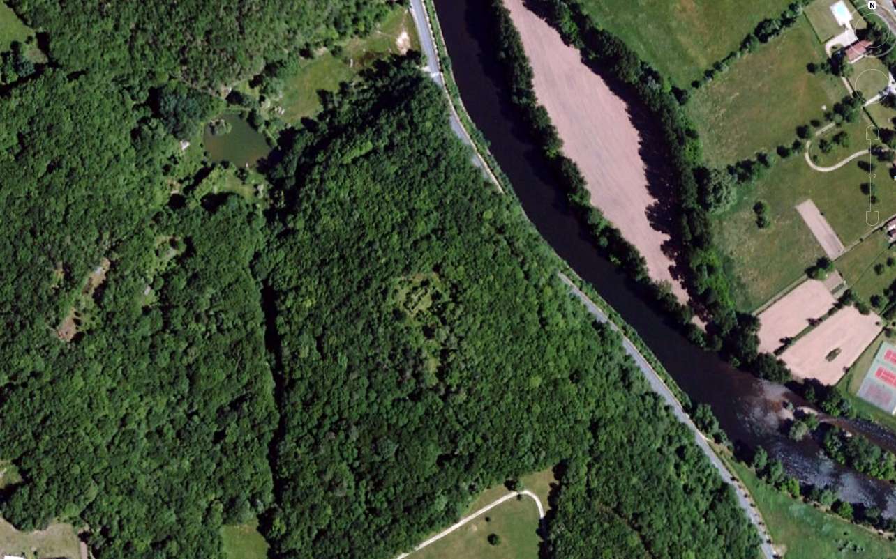 The gorge starts at the top of the photo, beside the road and the Vézère River, with the abris on the true left of the open area, that is on your left as you look from the open area of the little valley and creek towards the main road. The minor dirt road runs through the trees on the true right of the gorge, finishing in the farmer's field at the bottom left centre of the photograph.