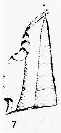 Fig. 2. A long curved flake of dark-grey granular flint, similar in general character to fig. 1. The straight portion of the left-hand edge in the figure is sharp and finely jagged, and has probably been used. As an implement, this flake could be conveniently held in the hand by the lower curved portion, and