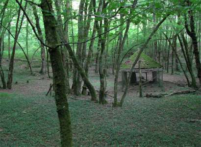 The little dry valley soon flattens out, and gives views such as this of old abandoned buildings and forests with open floors.
