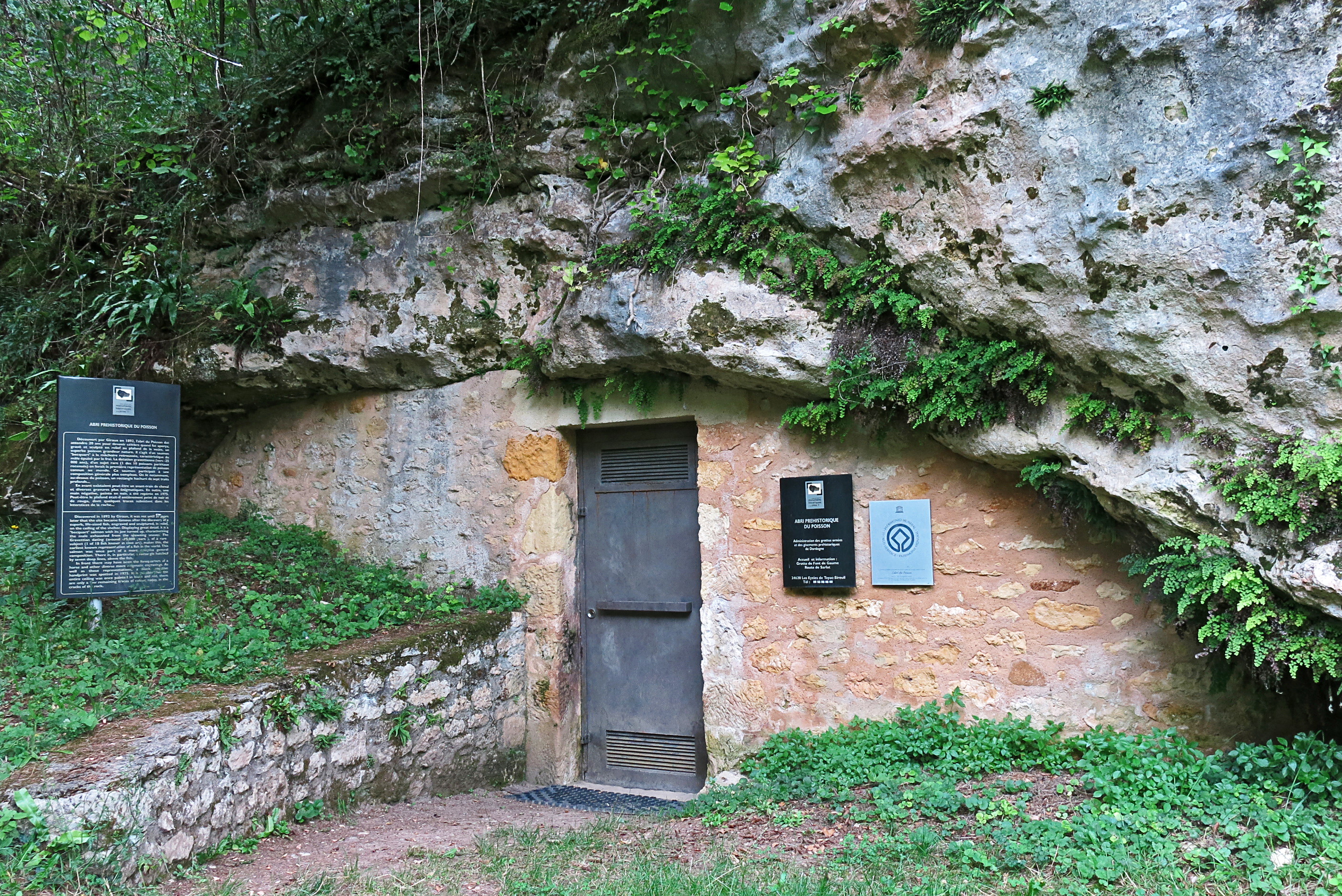 Here we can see the stone wall and steel door of l'abri Poisson, the low abri Lartet, and above these the start of the Grand Abri, with the main chamber out of frame to the left of this photo.