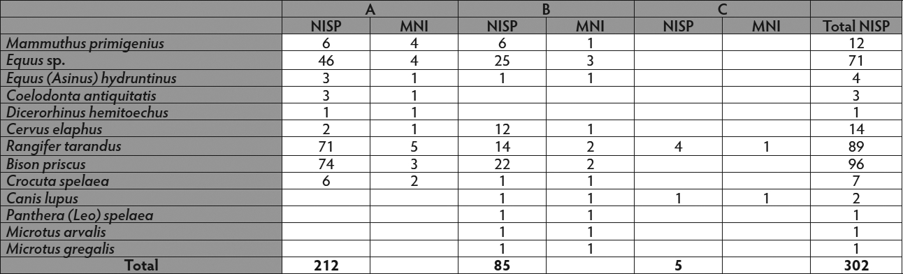 In general, it constitutes a closely paved horizontal place predominantly consisting of small objects. Pieces less than 10 cm represent 83% of all objects found there and forming the pavement. 60% of them are stones, 38% are bones, splinters of bones, teeth, antler fragments and 2% are evidence of wood. They represent material which was hardly suitable for any use, tools are almost missing and the skeletal assemblage consists of insignificant refuse.