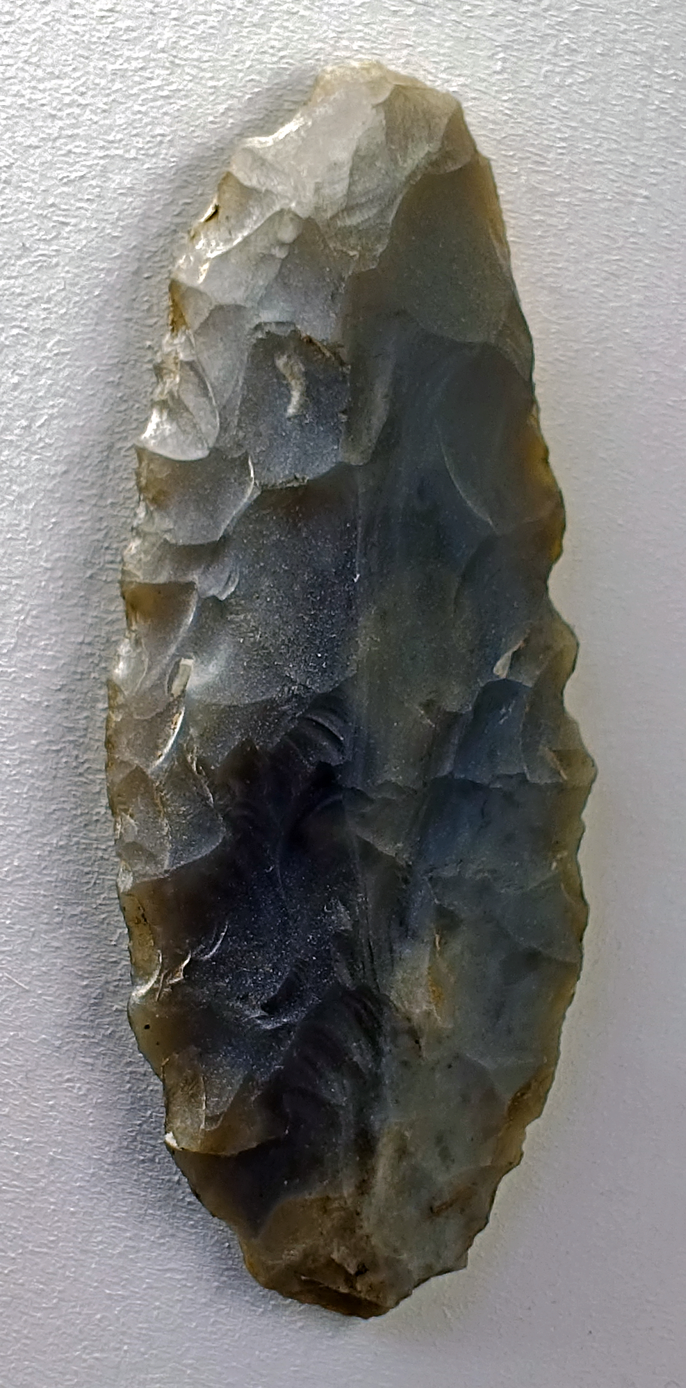 From left to right: Drill, scraper, Font Robert point (stemtip, tanged tool created on blade, shouldered point), broken.