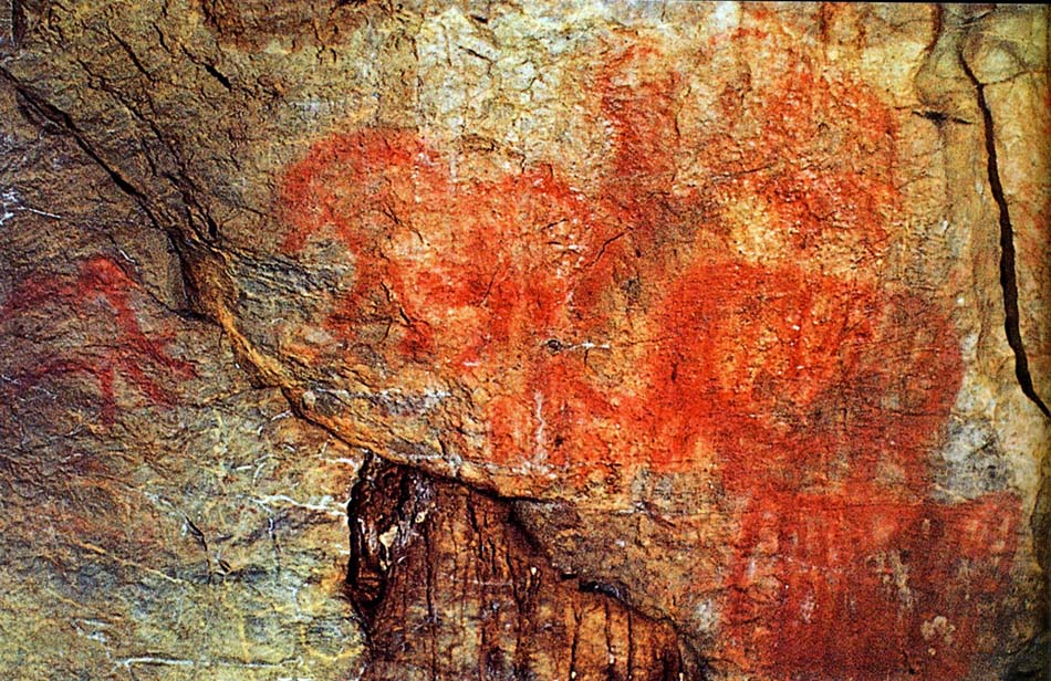 Horse, mammoth and rhinoceros painted in red in Kapova cave.