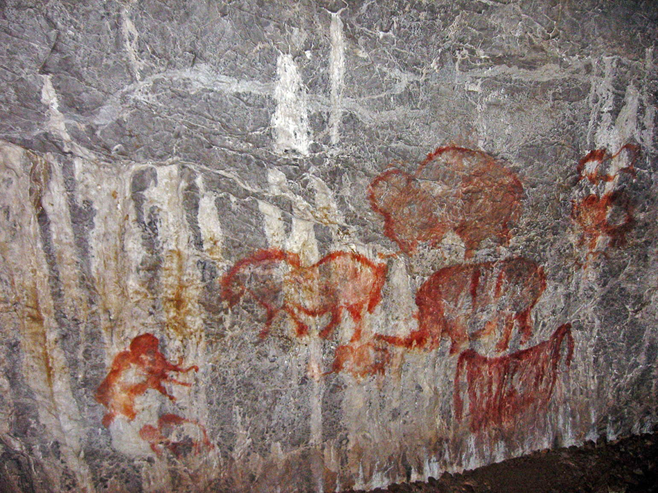 Kapova Cave, paintings of mammoths, a horse, and a rhinoceros.