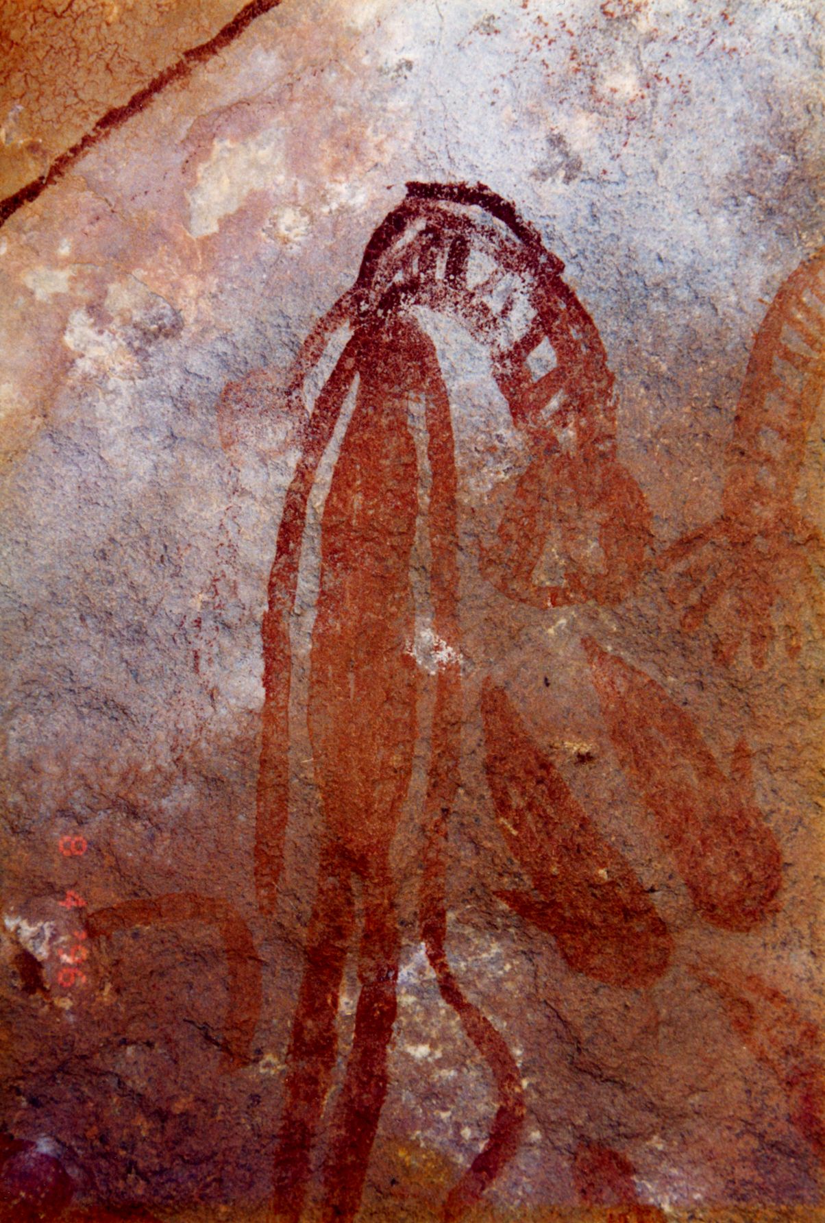 According to legend, the Bradshaw figures were made by birds. It was said that these birds pecked the rocks until their beaks bled, and then created these fine paintings by using a tail feather and their own blood. This art is of such antiquity that no pigment remains on the rock surface, and it is impossible to use carbon dating technology. The composition of the original paints cannot be determined, and whatever pigments were used have been locked into the rock itself as shades of mulberry red, and have become impervious to the elements.