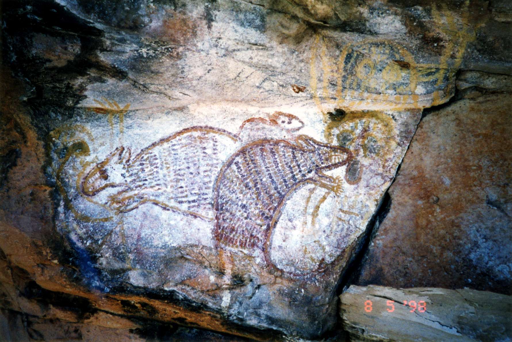 This painting of a marsupial has erect ears, front legs shorter than the back, and a long, heavy tail. The painting was found just after leaving camp at Camp Site Creek.