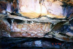 Above the coolamons is a figure drawn in dark red ochre which looks something like the "ghosts" of the art works near the Drysdale River, shown further up this page.