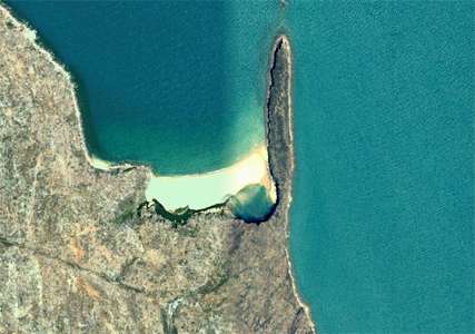 It is unusual to see such a long and narrow peninsula of fairly even width jutting so far out to sea. Note the sand bar and lagoon behind it to the west of the peninsula.