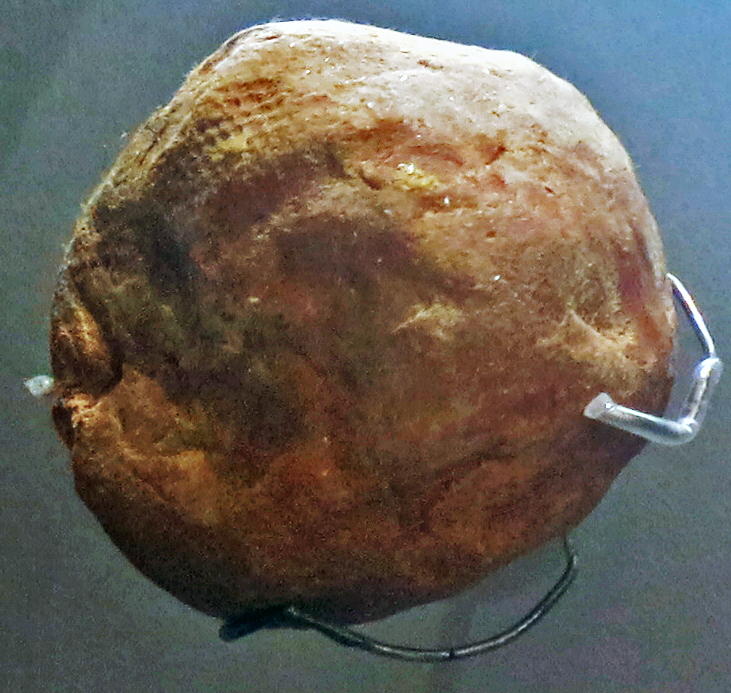 On this small ball shaped piece of clay can be seen regular marks which are similar to those made by the imprint of textiles.