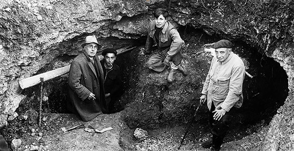 Entrance to the Lascaux Cave at the end of September, 1940. From left to right: Leon Laval (teacher), Marcel Ravidat, Jacques Marsal (the two discoverers) and Henri Breuil. Successive alterations would bring about an important widening of the entrance, enlarging it from the sub-vertical shaft through which the discoverers had entered the cave for the first time, to the entire breadth of the gallery.