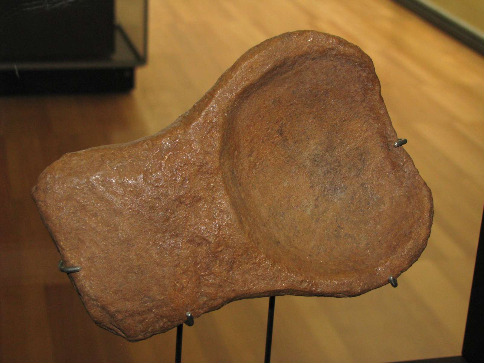 Lamp from the grotte des Scilles (Haut-Garonne) Middle Magdalenian. MAN. fine grained slightly micaceous soft red sandstone. Length 200 mm. max width 108.2 mm. bowl diameter 101.6 mm. depth 22 mm.