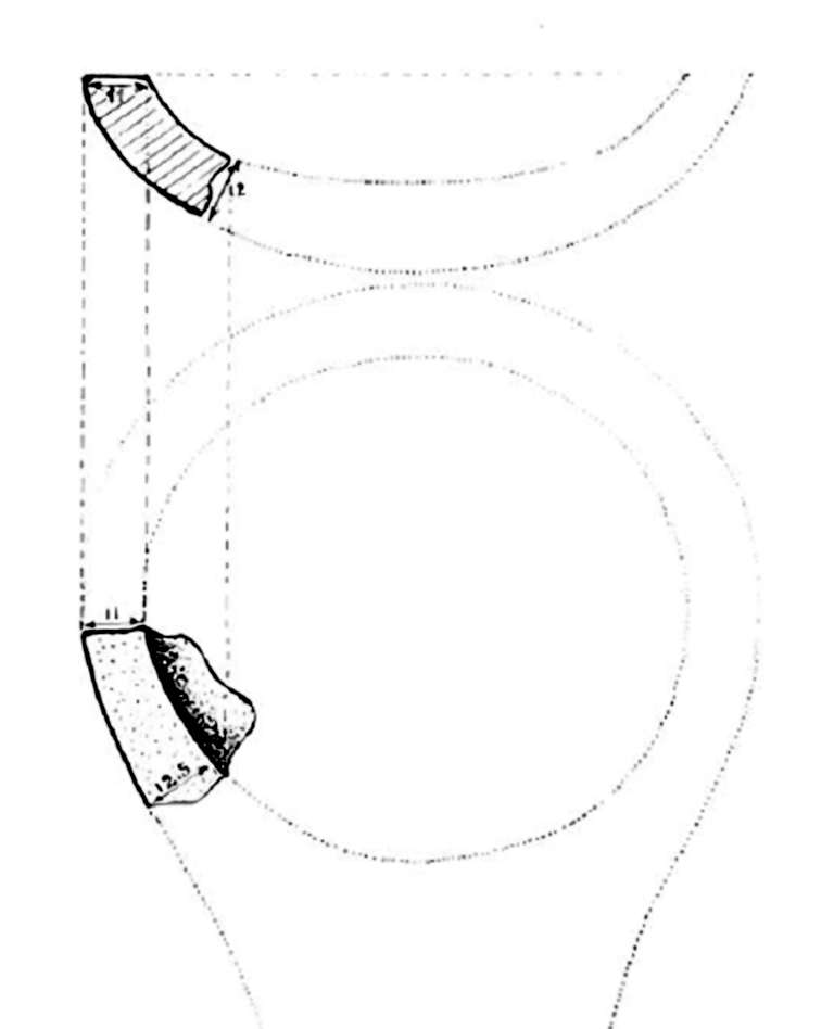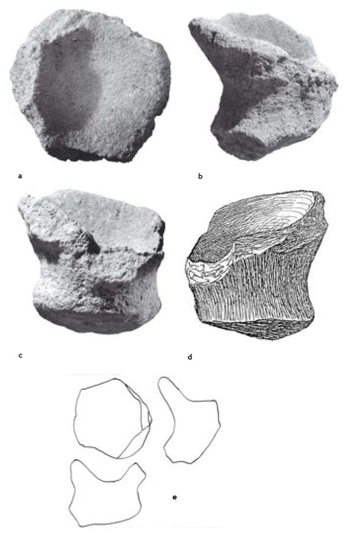 Dimensions. - The greatest length, nearly axial, reached 120 mm and the width varies from 85 to 115 mm, the thickness, variable, does not exceed 48 mm. The cup, almost circular, has diameters between 55 mm and 58 mm, while the depth at the centre reaches 14mm. The weight is 1035 grams.