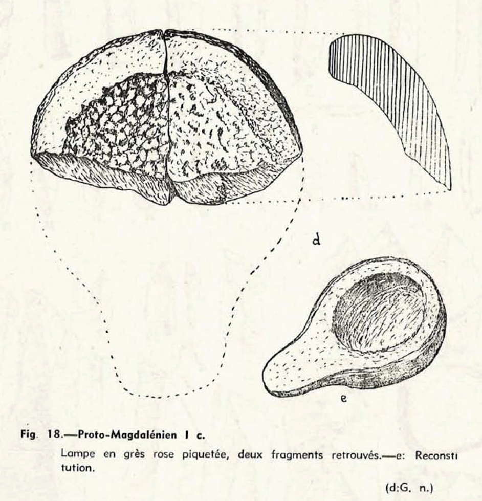 Since then, D. Peyrony noted black residue and traces of fire in the bottom of limestone cups from La Madeleine, R. Saint-Perier saw black marks on the edge of a curved sandstone fragment from Isturitz, Dr. Cheynier, on the edge of a large shell fossil at the site of Badegoule (Dordogne). There were found to be areas reddened by fire on hollowed limestone blocks at Pair-non-Pair. These indications are few in number, whereas the other fifty articles classified as 'lamps' have no signs of the action of fire.