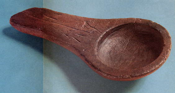 Glory's most spectacular find in the Shaft was a lamp (bruloir ) in a ground layer below the tail of the rhinoceros. "Shaped like a large spoon made of red sandstone, 8 3/4 inches long by 4 3/16 inches wide and 1 1/4 inches thick, the lamp is finely polished and symmetrical. Its shallow oval cup serves as a receptacle for fuel. It has a capacity of two fluid ounces. The upper surface of the handle is decorated with two abstract signs of chevrons fitted into each other, such as are found painted or engraved in various parts of the cave."