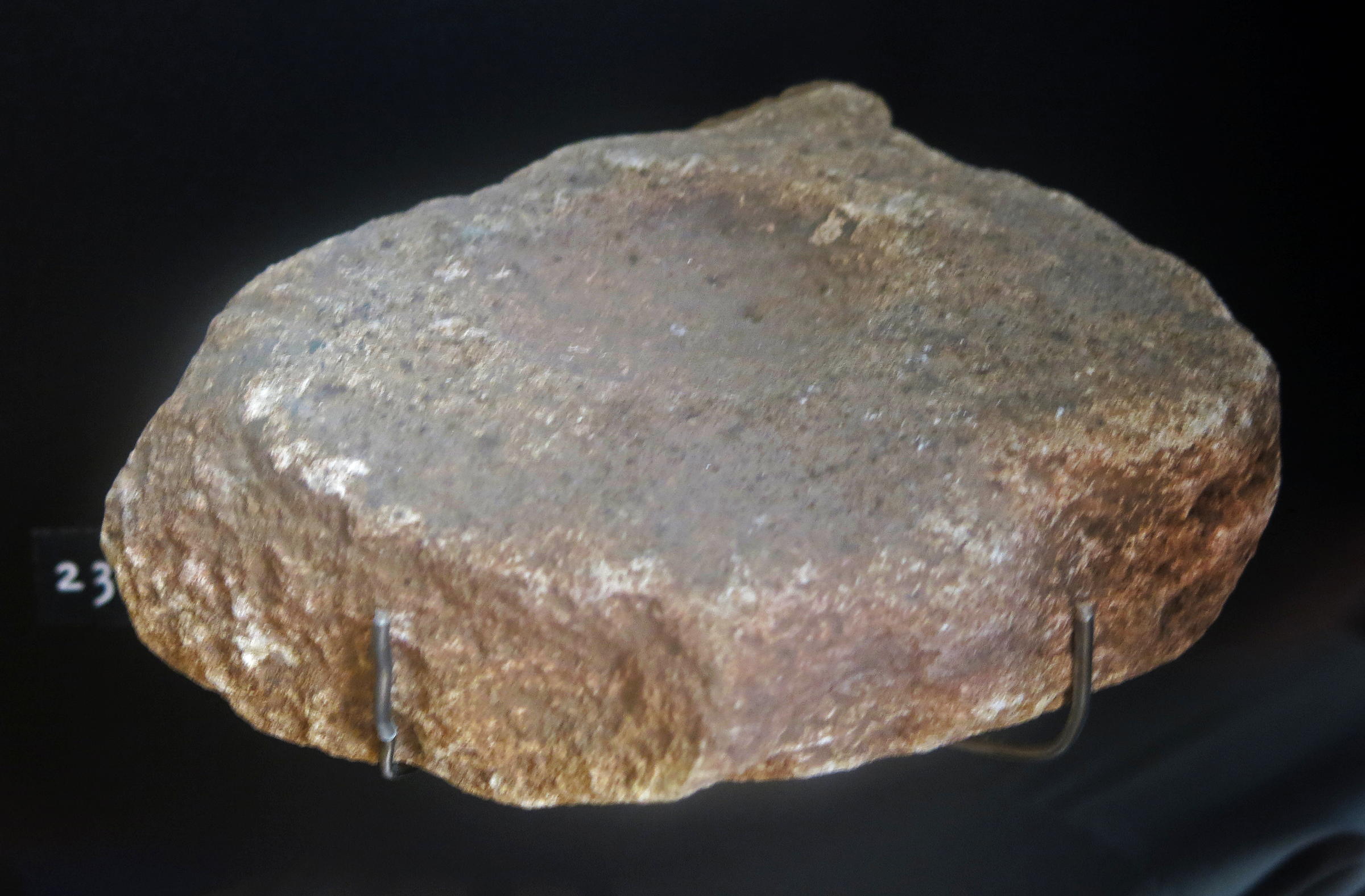 This sandstone lamp from Solvieux, broken in four pieces, shows a shallow depression for the grease and wick. It is dated to the early Magdalenian, and comes from couche A in locality 3 of Solvieux.