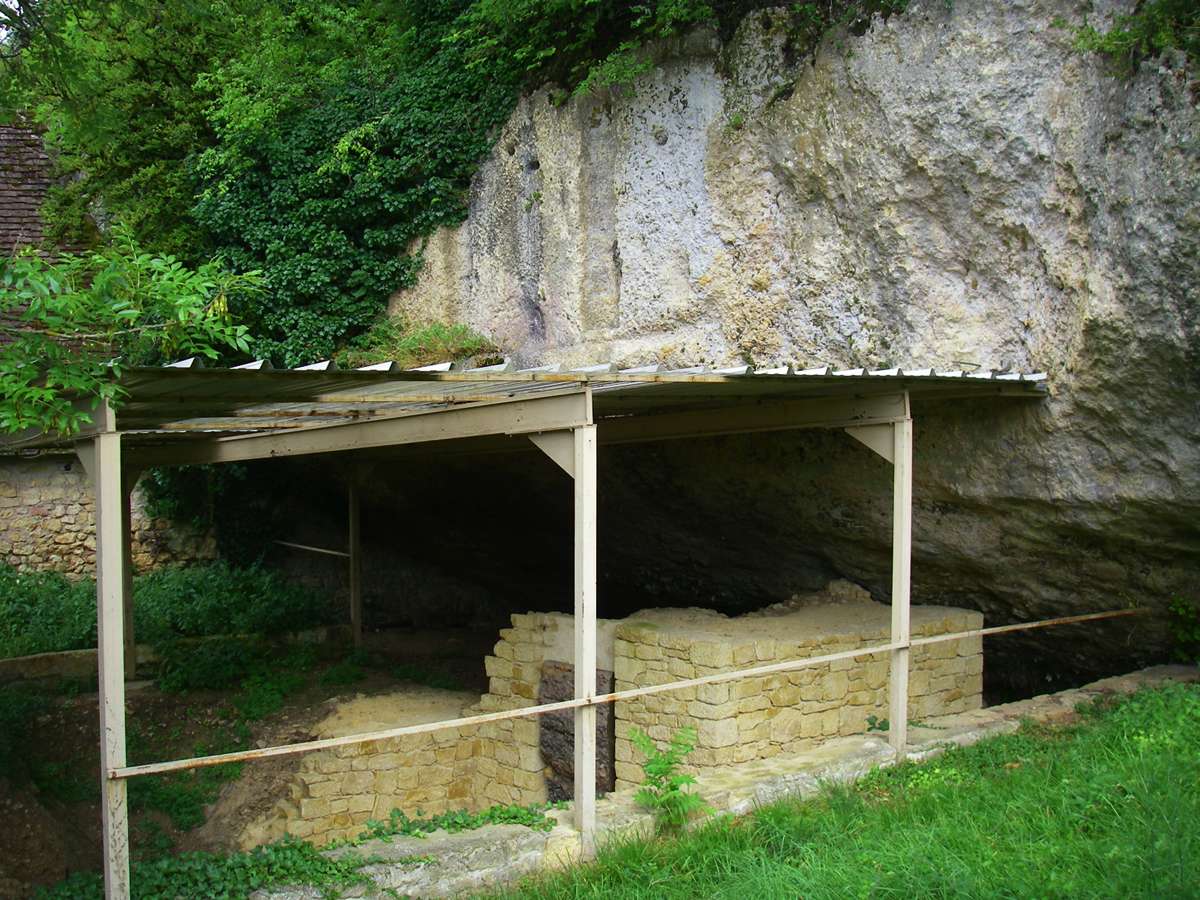 The lower shelter is 14 metres below the upper, and occupies the base of the cliff in the village itself, the bedrock being lower than the modern riverbank. It was first excavated in 1907. Most recently, Laville and Rigaud conducted well organised excavations there in 1969. The bulk of the deposit has been removed, but a control section for later work remains.
