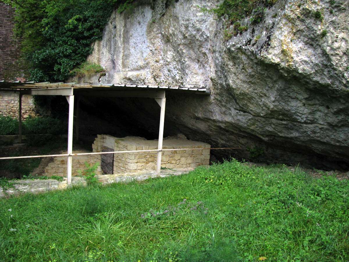 The Vimont Rau, also known as the Rau du Moustier, is the little stream which flows past Le Moustier and into the Vezere. In this photo can be seen the Lavoir on the left, the Vimont or Moustier flowing from left to right, and behind the Vimont is the hill of le Moustier between the bare branches of the trees, with the village of le Moustier on the right.