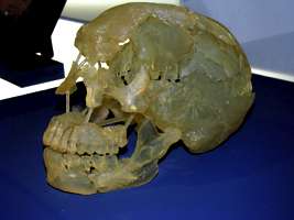 Skull of Le Moustier 1, created by the Stereolithography process. Normally the result would then be hand coloured to accurately reflect those of the original object, but the facsimile has been left in its raw state in this case, presumably to more dramatically show the process.